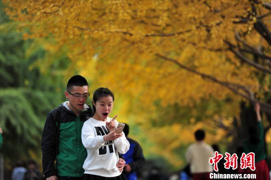 10月12日,金灿灿的银杏叶成了辽宁大学校园里的一道风景,大批沈阳市民来此合影,有人戏称这是沈阳的“土豪金大街”。中新社发 于海洋 摄