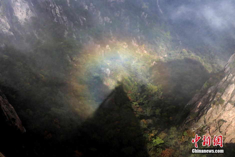 10月12日,安徽黄山风景区拍摄的 “佛光”奇观。据黄山志记载,“佛光”是一种特殊的自然物理现象,其本质是太阳自观赏者的身后,将人影投射到观赏者面前的云彩之上,云彩中的细小冰晶冰与水滴形成独特的圆圈形彩虹,人影正在其中。“佛光”的出现无原则要阳光、地形和云海等众多自然因素的结合,只有在极少数具备了以上条件的地方才可欣赏到。中新社发 施广德 摄 图片来源:CNSPHOTO