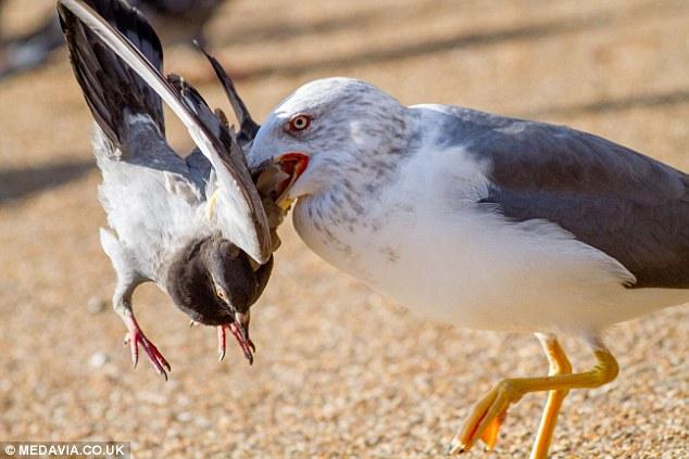 饥饿海鸥猎食鸽子 惊呆小伙伴