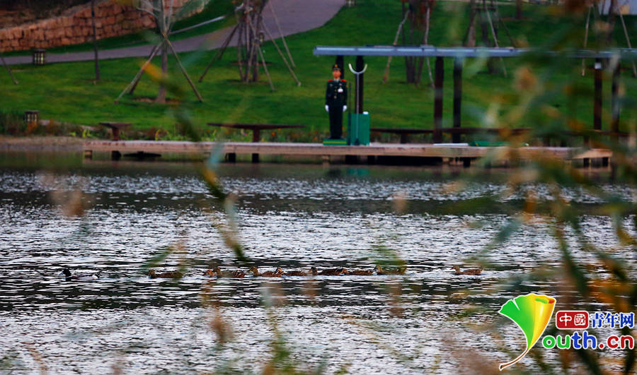 10月14日,雁栖湖核心岛前野鸭成群游过,不远处的安保人员已经正常出勤,确保2014APEC会议顺利召开。