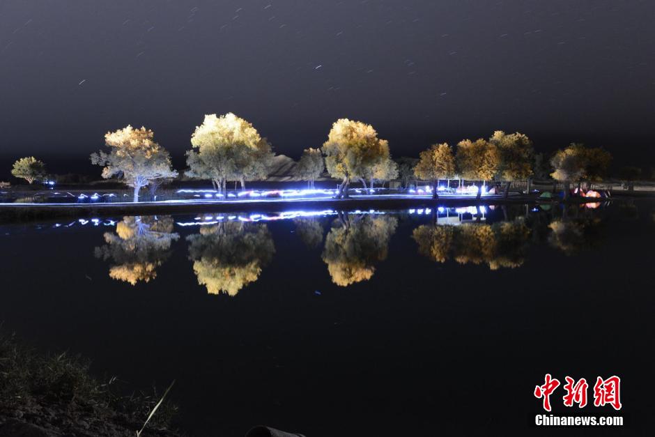 10月25日,游客在新疆尉犁县境内的胡杨树里游玩。每年十月下旬,塔里木盆地的胡杨林正是金黄灿烂、美丽多姿的迷人时节,一副副动人独特的画卷令国内外众多游客陶醉。图为10月25日,新疆尉犁县罗布人村寨的胡杨林夜景格外迷人。 确·胡热 摄