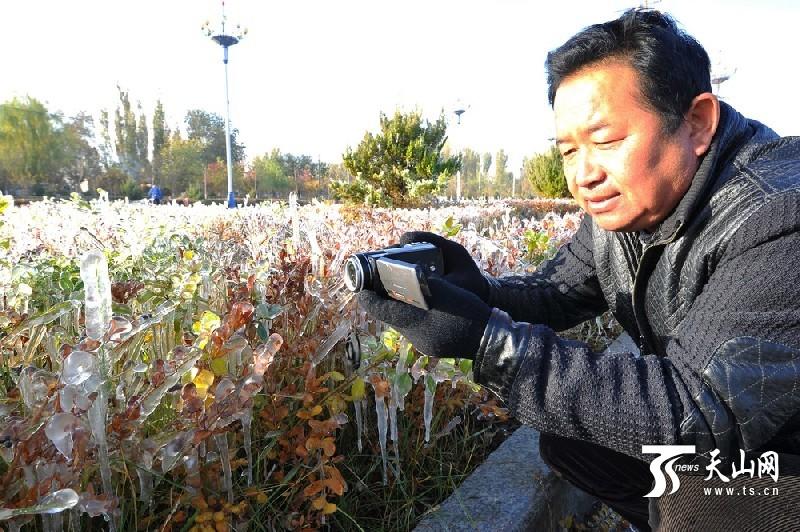 受冷空气影响,新疆哈密市出现强降温天气,秋日街头的绿化带里出现了罕见的冰挂景观,吸引了市民观看和拍照。图为10月30日,新疆哈密市现冰挂。李华摄影报道 图片来源:天山网