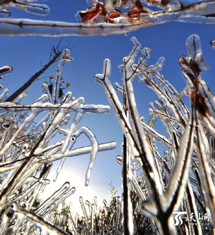 受冷空气影响,新疆哈密市出现强降温天气,秋日街头的绿化带里出现了罕见的冰挂景观,吸引了市民观看和拍照。图为10月30日,新疆哈密市现冰挂。李华摄影报道 图片来源:天山网