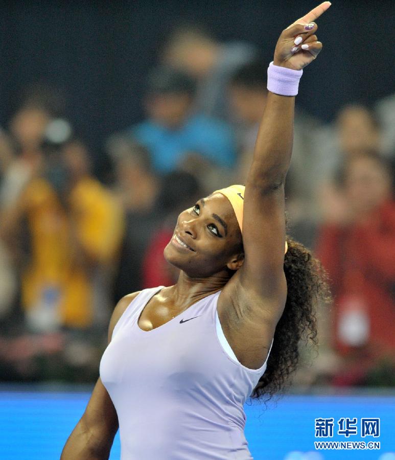10月6日,小威在夺冠后向观众致意。当日,在2013中国网球公开赛女单决赛中,美国选手塞雷纳·威廉姆斯以2比0战胜塞尔维亚选手扬科维奇,夺得冠军。 新华社记者李文摄