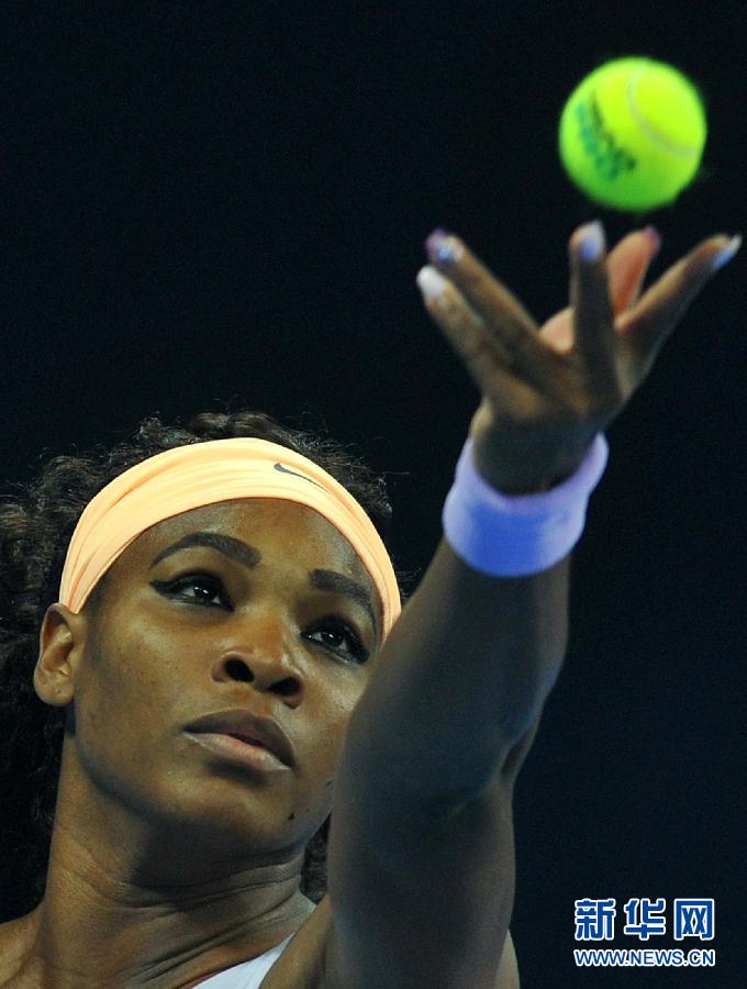 10月6日,小威在比赛中发球。当日,在2013中国网球公开赛女单决赛中,美国选手塞雷纳·威廉姆斯以2比0战胜塞尔维亚选手扬科维奇,夺得冠军。 新华社记者公磊摄