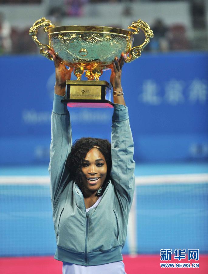 在颁奖仪式上高举奖杯。当日,在2013中国网球公开赛女单决赛中,美国选手塞雷纳·威廉姆斯以2比0战胜塞尔维亚选手扬科维奇,夺得冠军。 新华社记者李文摄