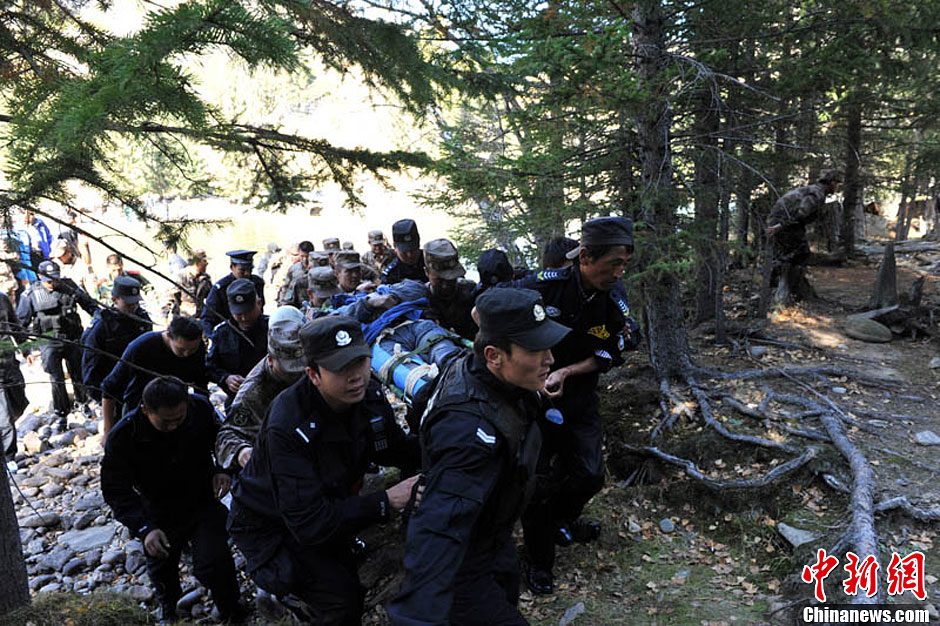 10月7日,“十一”长假最后一天,新疆富蕴县可可托海,国家5A级风景区仍然游人如织,游客数量仍然保持在一万人次左右的高位。11时许,有游客通过电话向执勤民警报警,称自己驾驶动力伞在景点航拍,起初飞行正常,但不久后飞行器出现故障,同伴及飞行器从空中坠落,掉在深山里,伤势严重,请求救援。富蕴县公安局组织30余警力,联合武装部、边防武警、医院等多个单位,进入山区展开联合搜救。经过四个小时的搜索,最终找到坠落的飞行器和两名乘员,两名乘员均有肢体骨折,并有轻度昏迷。经现场救护后,公安民警、武警官兵用担架将伤者从山里转运出来,医院派出救护车将伤员送往医院作进一步治疗。目前,伤者伤情稳定,无生命危险。万晓旭 摄
