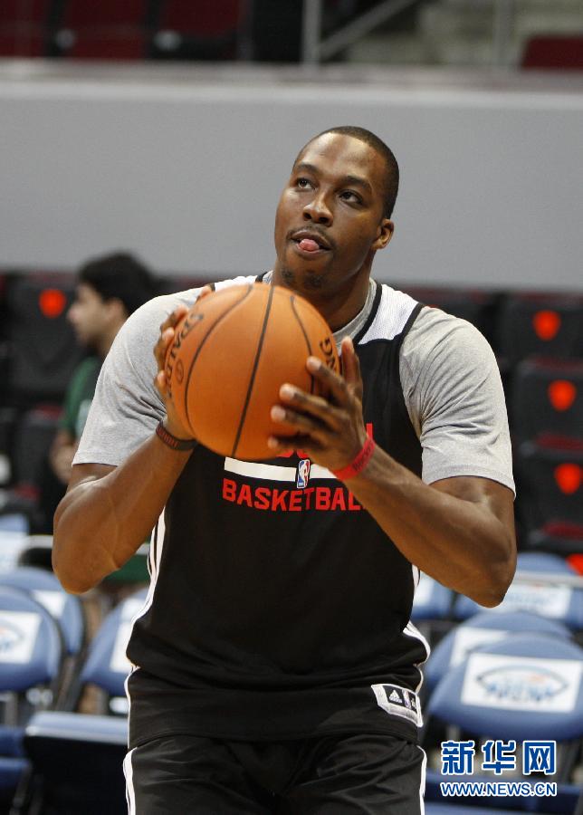 10月8日,火箭队球员霍华德在训练中投篮。当日,休斯敦火箭队在菲律宾马尼拉亚洲商场体育馆训练,备战将于10日同印第安纳步行者队进行的NBA季前赛。新华社发(宋穹摄)