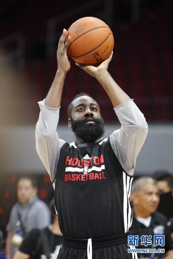10月8日,火箭队球员哈登在训练中投篮。当日,休斯敦火箭队在菲律宾马尼拉亚洲商场体育馆训练,备战将于10日同印第安纳步行者队进行的NBA季前赛。新华社发(宋穹摄)