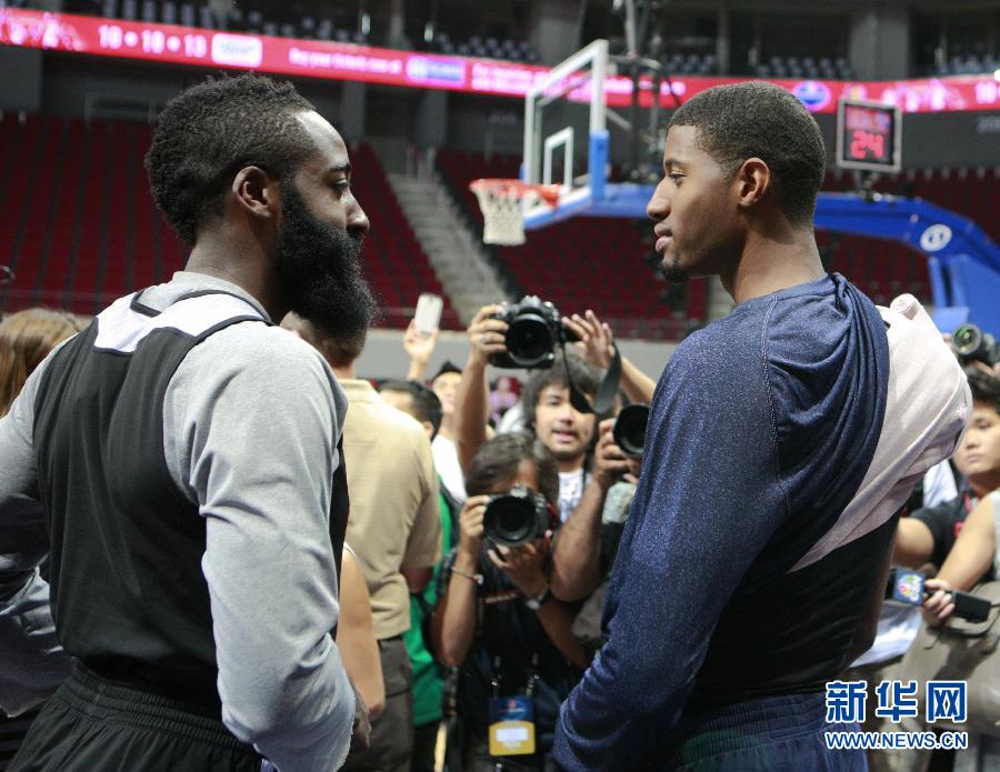 10月8日,火箭队球员哈登(左)同步行者队球员乔治交谈。当日,休斯敦火箭队在菲律宾马尼拉亚洲商场体育馆训练,备战将于10日同印第安纳步行者队进行的NBA季前赛。新华社发(宋穹摄)