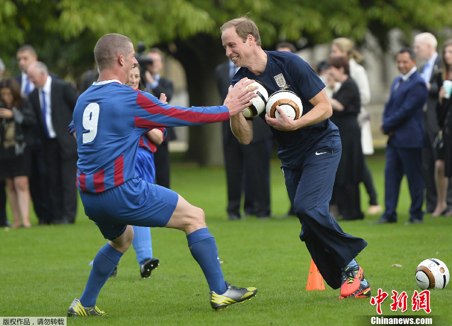 2013年10月7日,伦敦,威廉王子在白金汉宫的草地上大玩足球以纪念英国足协150周年。