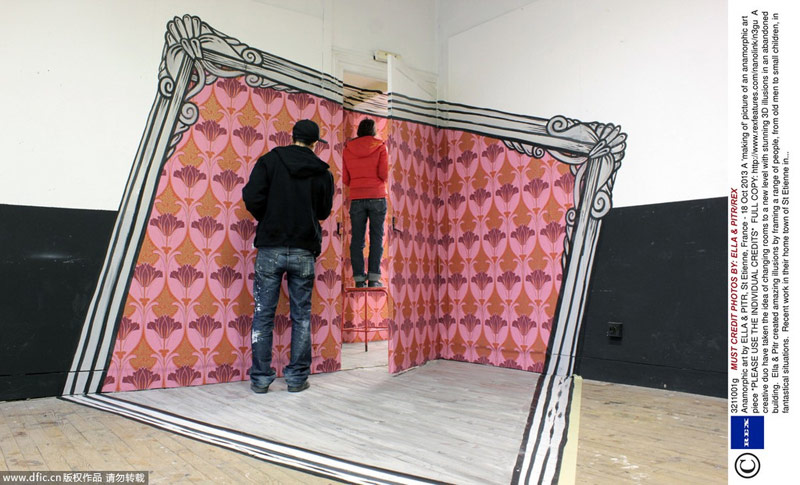 2013年10月24日报道,法国街头艺术家二人组Ella与Pitr利用3D视错觉将室内装修提升到一个新的境界。他们发挥天马行空的想象力,把各种各样的人框在跨越空间的相框里,带来神奇的视觉体验。他们的最新作品是在家乡法国圣埃蒂安的废弃建筑中创作的,利用变形手法在地板、墙壁及天花板上绘制出各式相框,仿佛能让人走进一个色彩缤纷的异度空间。