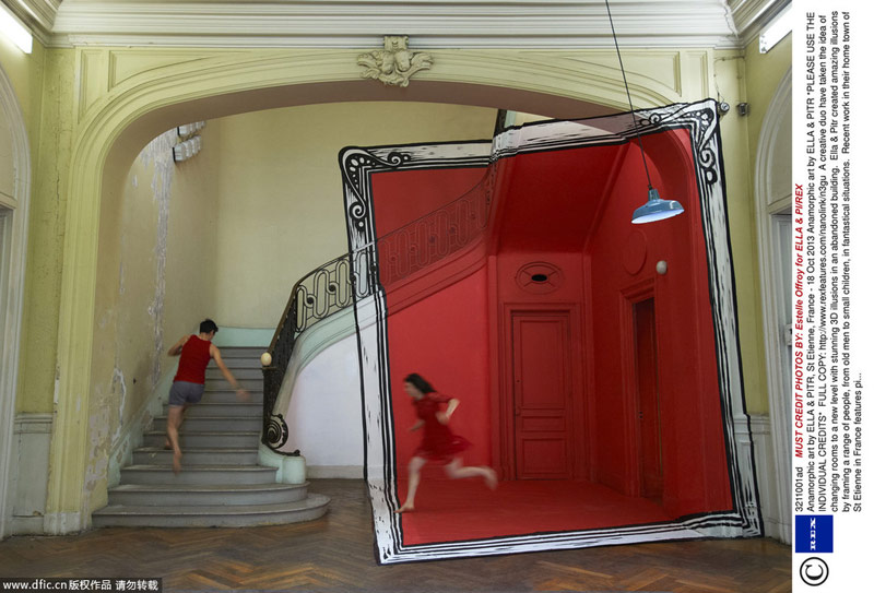 2013年10月24日报道,法国街头艺术家二人组Ella与Pitr利用3D视错觉将室内装修提升到一个新的境界。他们发挥天马行空的想象力,把各种各样的人框在跨越空间的相框里,带来神奇的视觉体验。他们的最新作品是在家乡法国圣埃蒂安的废弃建筑中创作的,利用变形手法在地板、墙壁及天花板上绘制出各式相框,仿佛能让人走进一个色彩缤纷的异度空间。