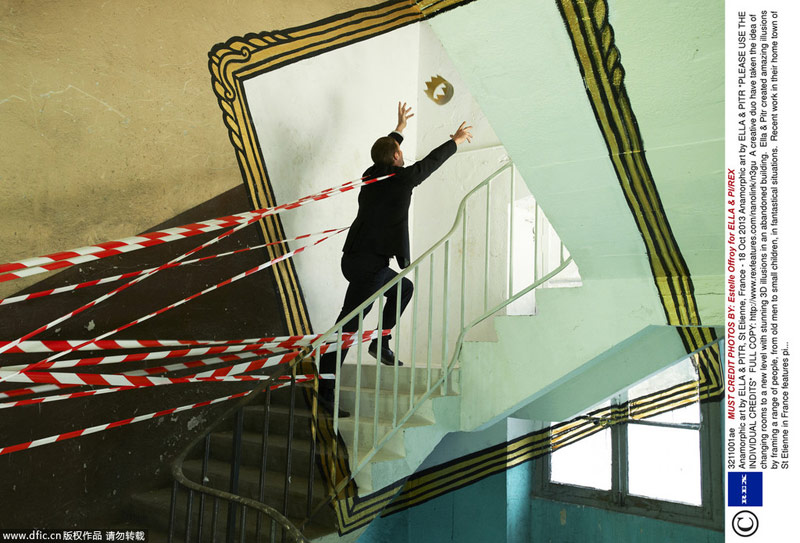 2013年10月24日报道,法国街头艺术家二人组Ella与Pitr利用3D视错觉将室内装修提升到一个新的境界。他们发挥天马行空的想象力,把各种各样的人框在跨越空间的相框里,带来神奇的视觉体验。他们的最新作品是在家乡法国圣埃蒂安的废弃建筑中创作的,利用变形手法在地板、墙壁及天花板上绘制出各式相框,仿佛能让人走进一个色彩缤纷的异度空间。