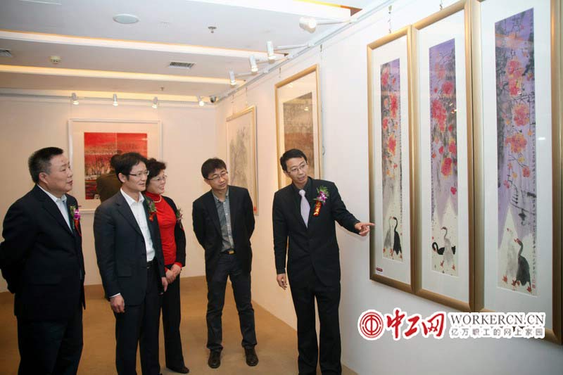 10月26日,由光大银行、紫金支点技术有限公司共同主办的“中国红——宋斌艺术中国展”在北京光大银行私人银行中心隆重开幕。宋斌的《中国红》、《红霞满天飞》等国画精品悬挂于北京光大银行私人银行中心营业厅里展出。图为宋斌(右一)向来宾介绍他的作品《相依》。 中工网记者 邱晔 摄