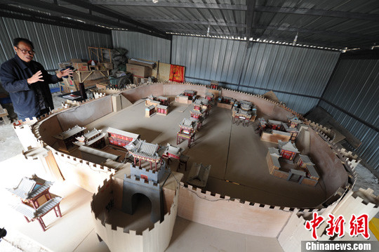 图为张耀宾精雕细琢复原过半的微缩明代古城。中新社发 杨艳敏 摄