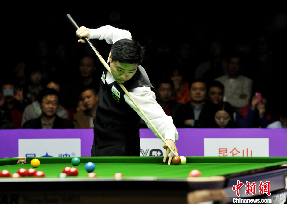11月4日凌晨,中国选手丁俊晖在成都举行的2013年世界斯诺克国际锦标赛决赛中打出6个一杆过百,10-9险胜傅家俊,继上海大师赛和印度公开赛背靠背夺冠之后,两个月内连续获得第三个大型排名赛冠军。创造了职业生涯最伟大的连续三冠的三冠王纪录,又一次改写中国斯诺克历史。安源 摄