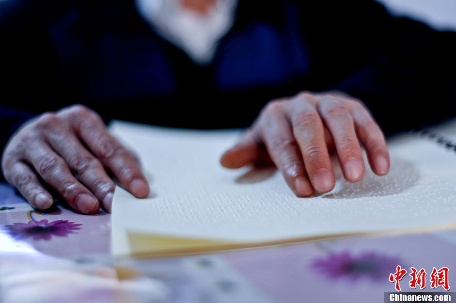 孟国鸣在家中阅读盲文。张学东 摄