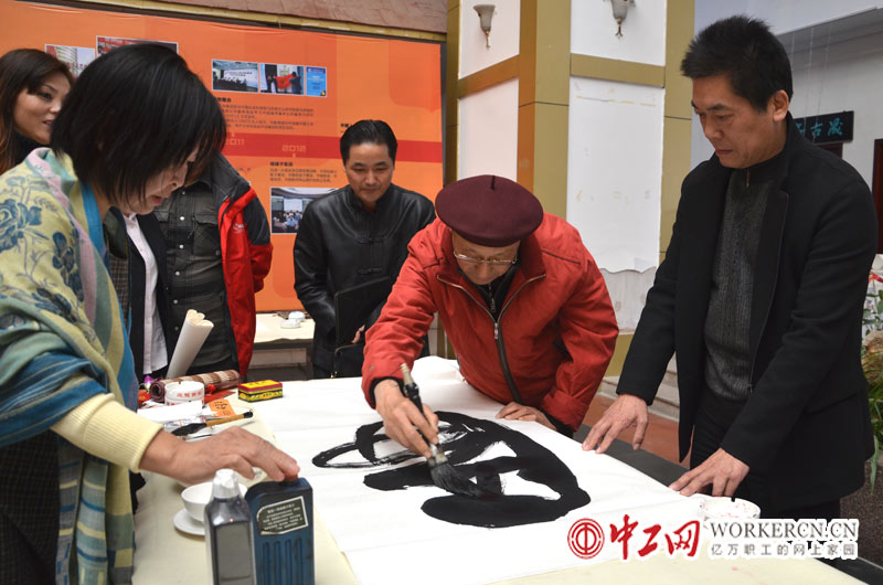 11月16日,画家姚少华在笔会上表演书法“一笔虎”。当日,由中国名家书画研究院、中国书画艺术产业联盟、中国华夏画院、华图教育等多家单位共同举办的纪念毛泽东诞辰120周年名家书画笔会在北京优龙会议中心举行。