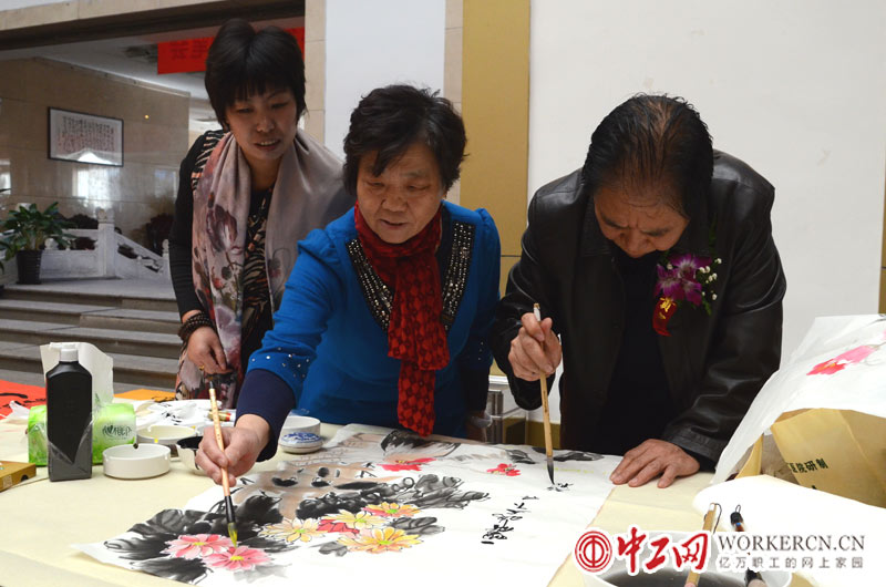 11月16日,画家魏治梅在笔会上与书法家共同创作艺术作品。当日,由中国名家书画研究院、中国书画艺术产业联盟、中国华夏画院、华图教育等多家单位共同举办的纪念毛泽东诞辰120周年名家书画笔会在北京优龙会议中心举行。