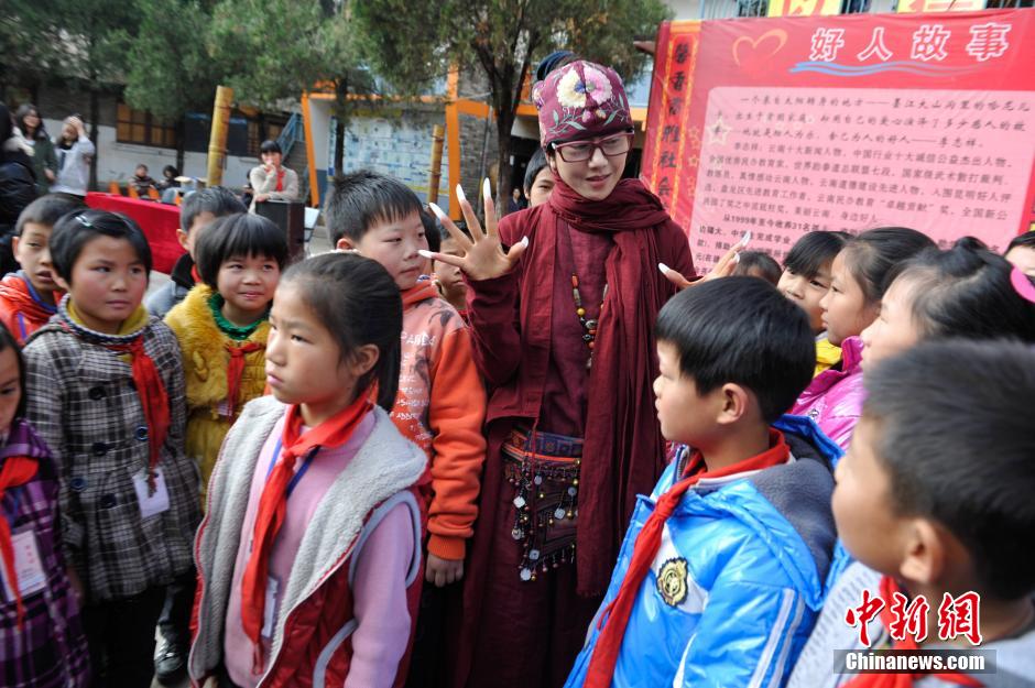 12月5日,杨丽萍与小朋友在交流。当日,舞蹈家杨丽萍现身昆明民办慈善公益学校德馨学校,邀请学生们免费观看杨丽萍国际舞蹈季首场表演《4D魔幻舞蹈秀》。受邀的学生大多为下岗工人和外来务工者子女及孤儿。中新社发 刘冉阳 摄