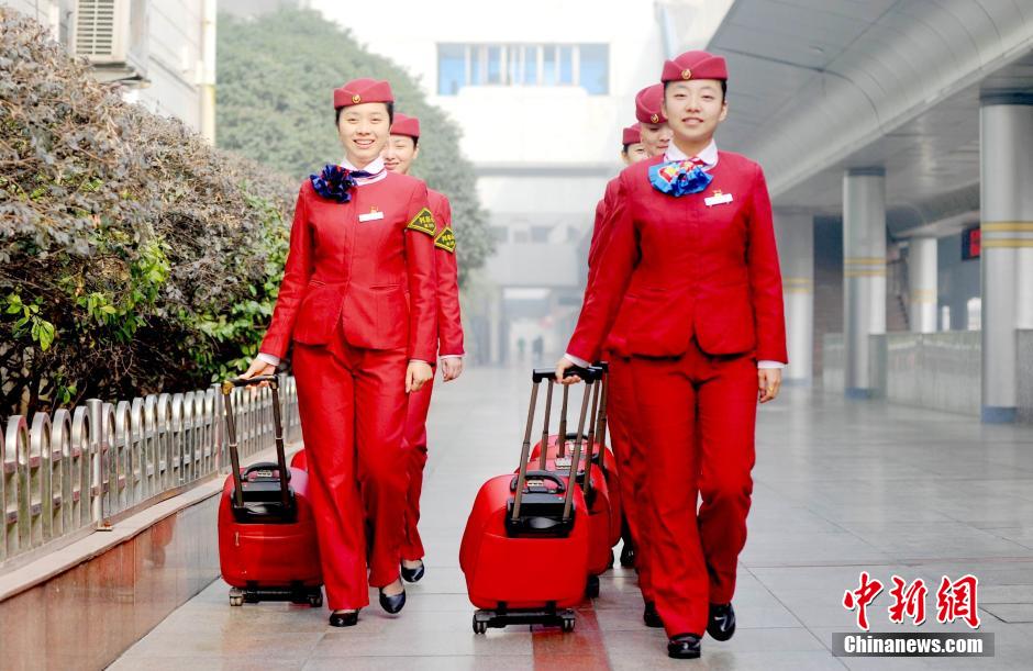 2014年春运即将来临,近日,记者跟随南昌铁路局南昌客运段一对名为“艳佳”组合的两位动车长一起出乘,记录美丽“动姐”们值乘的一天。据介绍,“艳佳”组合中的徐艳、熊佳两位车长,因其以“情满旅途,‘艳’丽人生;待客如亲,温暖如‘佳’”的独特服务法,受到旅客的好评与赞誉。图为出乘路上,大家列队整齐上岗。鲍赣生 摄