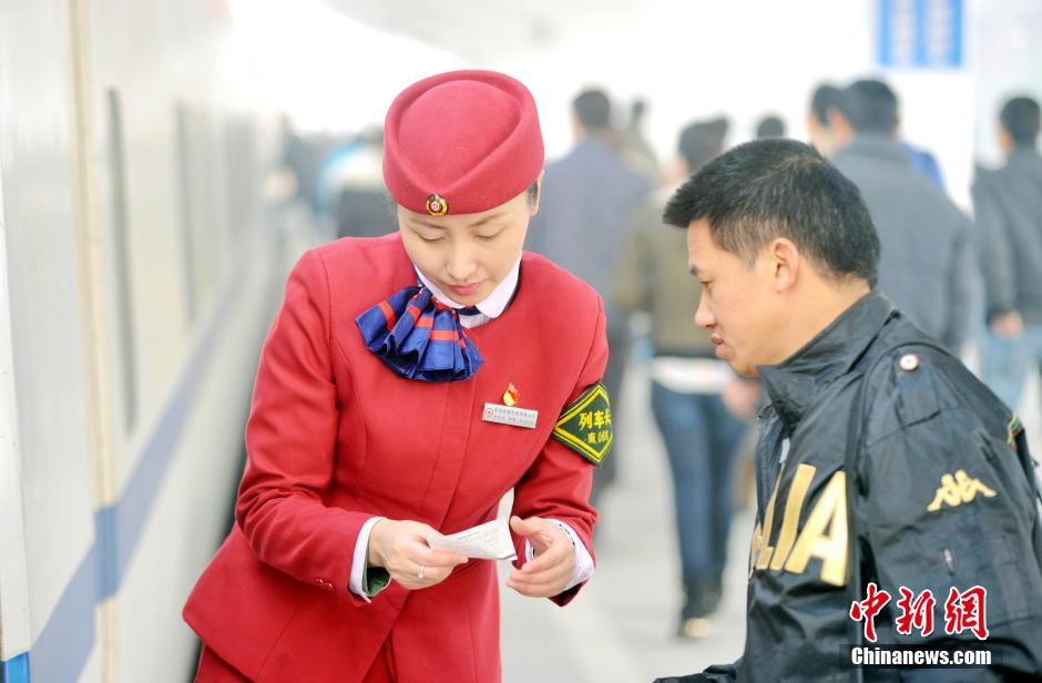 2014年春运即将来临,近日,记者跟随南昌铁路局南昌客运段一对名为“艳佳”组合的两位动车长一起出乘,记录美丽“动姐”们值乘的一天。据介绍,“艳佳”组合中的徐艳、熊佳两位车长,因其以“情满旅途,‘艳’丽人生;待客如亲,温暖如‘佳’”的独特服务法,受到旅客的好评与赞誉。图为列车长为上车的旅客引导。鲍赣生 摄