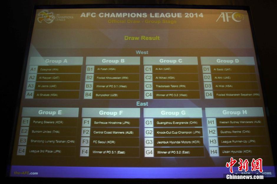 2013年12月10日,2014年亚冠联赛分组抽签仪式,恒大再战全北鲁能过招浦项人和抽下签。图片来源:Osports全体育图片社