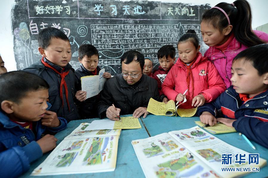 2008年秋,寺坪镇为小学三年级以上的学生开设了英语课,这使英语老师成为“稀缺资源”,为了让山里娃学到英语,当时41岁的寺坪镇中心学校英语教师阮班琼主动接手了全镇小学的英语巡回教学任务,从此便开始了他巡回支教的“长征路”。 5年来,阮班琼克服路途遥远、交通不便等困难,风雨无阻地穿行于全镇5所乡村小学之间,每天一个来回,每周要往返150多公里的山路。寺坪镇中心学校曾经让阮班琼回到镇中心学校教书,结束支教生涯,但阮班琼已经对5所走教学校的师生有了深厚感情,他说虽然很辛苦,但为了农村边远地区的学生能学到英语、享受公平的教育,他愿意把汗水继续洒在这条充满希望的路上。新华社发(杨韬 摄)