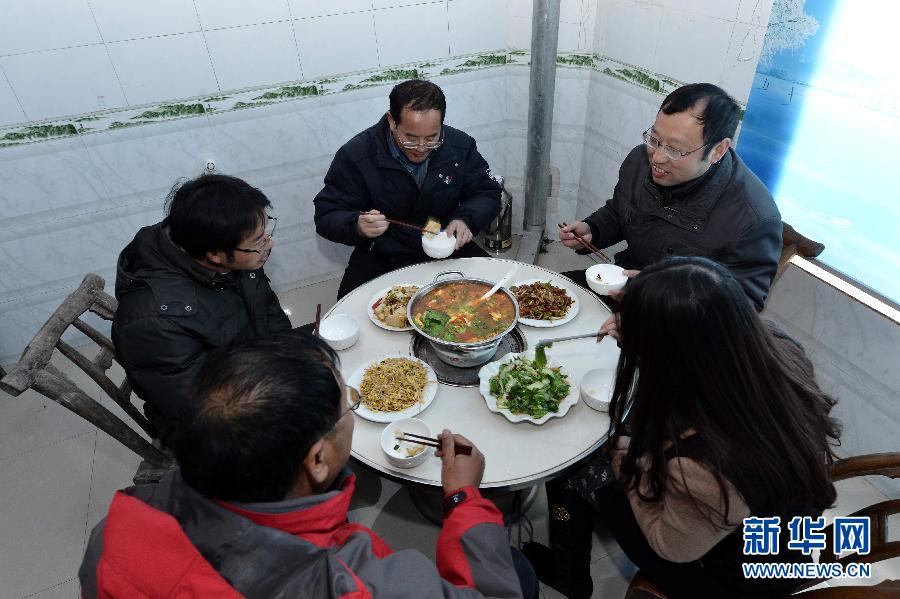12月10日,阮班琼(右上)与湖北省保康县寺坪镇李家村小学的教师一起吃午餐。在湖北省襄阳市保康县寺坪镇的崇山峻岭中分布着5所农村小学。