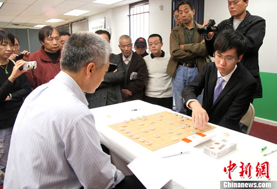 当地时间12月15日,集世界、全国冠军于一身的“世界棋王”、中国象棋特级大师赵鑫鑫(右)与休斯敦冠军一较高下。中新社发 王欢 摄