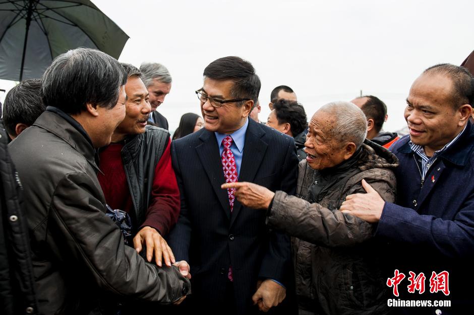 12月17日,美国驻华大使骆家辉与吉龙村村民握手。是日,美国驻华大使骆家辉回到位于广东台山水步镇吉龙村的祖居省亲。中新社发 龙宇阳 摄