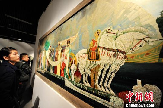 12月25日,市民在观赏陈文灿漆画作品《碧海丝桥》。张斌 摄
