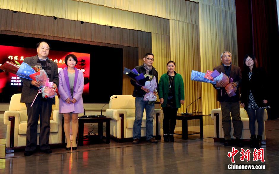 12月26日,中国首位诺贝尔文学奖获得者、中国作协副主席、北京师范大学国际写作中心主席莫言,江苏省作协副主席、著名作家苏童,清华大学教授、著名作家格非一行走进著名侨乡福建省福清市,出席由北京师范大学国际写作中心、福建省作家协会主办的以“如何讲述中国故事”为主题的作家讲座。当日,著名作家们的精彩讲座,博得现场观众如潮般的掌声。图为著名作家莫言走进侨乡福清出席以“如何讲述中国故事”为主题的作家讲座。刘可耕 摄