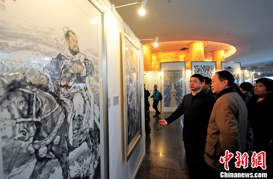 12月28日上午,《美丽中国—京、津、沪、渝书画名家作品邀请展》在北京世纪坛隆重开幕。图为北京市文化发展中心主任秦昌桂(中)在向参观者介绍展览。中新社发 陆欣 摄