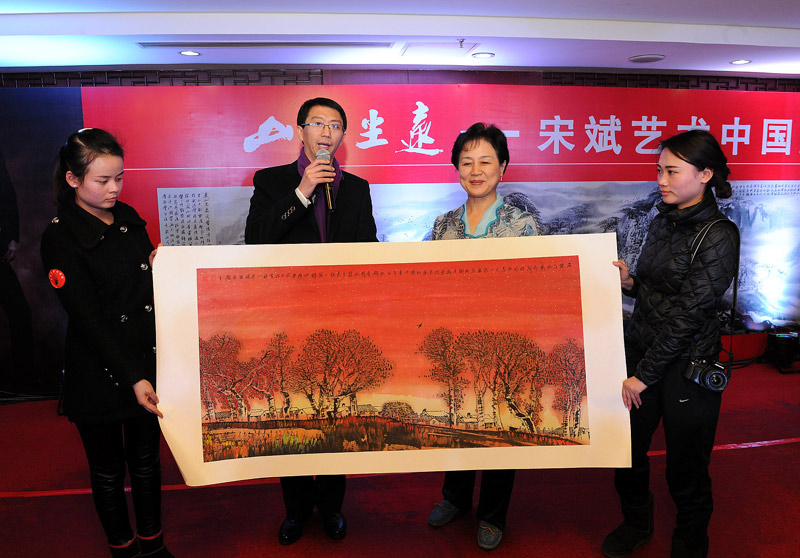 12月28日,山幽尘远——宋斌艺术中国展在北京开幕。此次展览展出宋斌精心创造《雾凇山水》、《大树》、《中国红》、《中国蓝》、《五花山》、《咏鹅》、《小品》等系列经典作品68幅,作品《山幽尘远》,长6米,宽1.2米,以恢弘的气势描绘了北方的雾松山水。活动以宋斌艺术中国展为重心结合了歌舞乐器表演,让多种艺术形式展示在观众人面前。  中工网记者 邱晔 摄