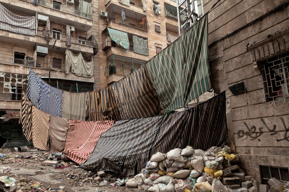 自叙利亚冲突以来,叙利亚的城市阿勒颇就处于战争中。对于那些在阿勒颇前线的人来说,条纹布帘都是再熟悉不过的。此前,这种条纹布帘是商店的遮阳蓬、幕布、窗帘,而现在,这却成为躲避致命威胁的防护盾。