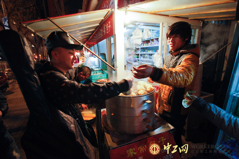 由于在当地很多人都认识他,再加上东北冬天很冷,母亲治病急需手术费,胡忠军在朋友的鼓励下,2011年底,胡忠军只身一人来到了北京,开始了街头卖艺生活。他生活很节俭,每次去唱歌的路上都会在街边随便买点吃的当晚餐。(中工网记者 韩靖摄)