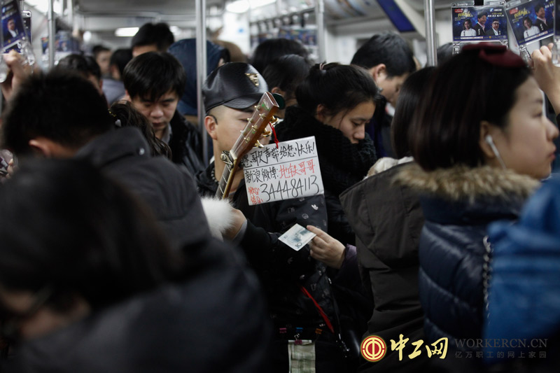 胡忠军说,地铁就是他的舞台,在这个舞台上不光有他自己,每一个乘客都是这个舞台的主角。有一次,胡忠军照例在地铁里唱歌,突然有一个40岁左右的中年人把他拦住,从包里拿出一摞钱,大约有五千块,中年人把钱往他的包里塞。可是胡忠军并没有收,他说,这么多的钱不应该属于他,不能要。结果中年人从钱包里拿出20块钱,下车前向胡忠军竖起了大拇指。(中工网记者 韩靖摄)