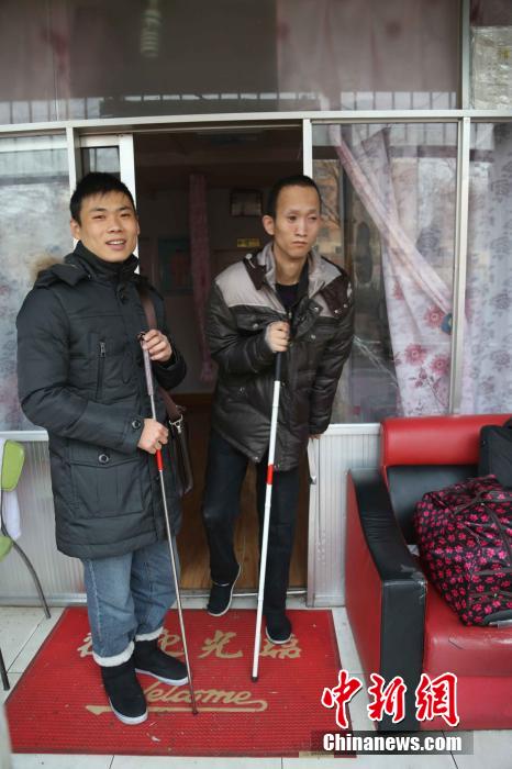 1月25日,在青岛城阳打工的盲人兄弟王富和黄锋踏上了他们今年平凡而特别的春运回家路。图为王富和黄锋早早起床穿戴整洁,准备好行李,回家的喜悦让他们迫不及待想动身。杨晓卫 摄