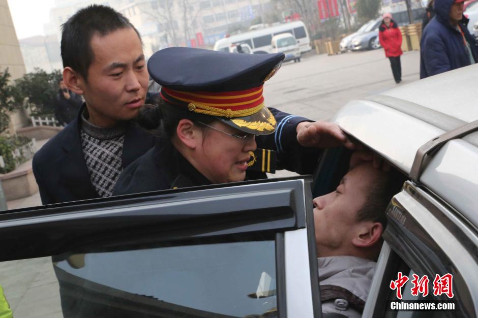 1月25日,青岛站客运人员从出租车上接下王富和黄锋兄弟俩。杨晓卫 摄