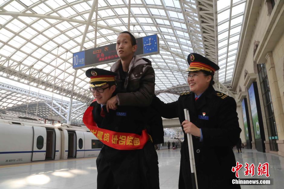 1月25日,客运值班员李震将行动不便的王富背上列车。杨晓卫 摄