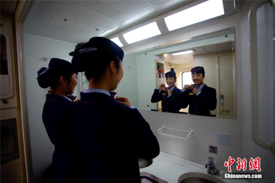 在成都开往北京西的T58/7次列车上,有这么一对双胞胎姐妹,姐姐叫严艺、妹妹叫严华,她们是2013年11月分配到成都铁路局成都客运段的高职生,经过系统培训考试后,今年1月14日她们正式上岗,成为双胞胎姐妹人生生涯中的首个春运。她们在值乘中的微笑给无数返乡旅客们带来了欢笑,她们的歌声无数返乡旅客们枯燥单一的旅行带来喜悦。她们常常满脸挂着微笑尽自己所能,热心引导旅客乘车,帮助旅客提行李,携老扶幼,向车厢内的旅客宣传安全知识。图为值乘成都至北京西T58次双胞胎列车员严华和严艺在整理衣帽。胡志强 摄