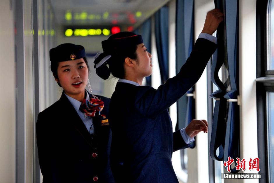 值乘成都至北京西T58次双胞胎列车员严华和严艺在整理窗帘。胡志强 摄