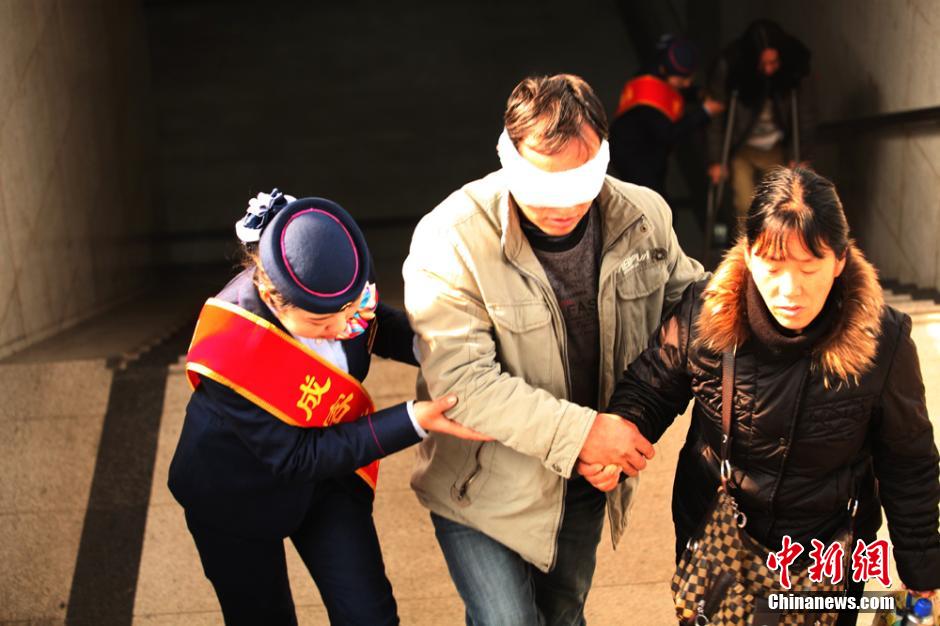 首次参加春运的双胞胎列车员严华、严艺,主动加入志愿者行列帮助重点旅客乘车。胡志强 摄