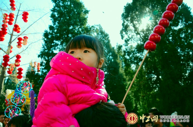 “糖葫芦”、风车等色彩艳丽的小物件依然薄利多销,当记者问及图中商家收入如何时,对方表示“总之很有‘年味’。” 中工网记者 笑语 摄