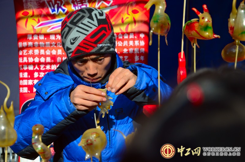 农历新年期间,集市上少不了的是传统工艺、民间绝活。图中吹糖人的师傅抿着嘴紧盯着手里还没有成型的糖人,小心调整着糖人的边边角角。