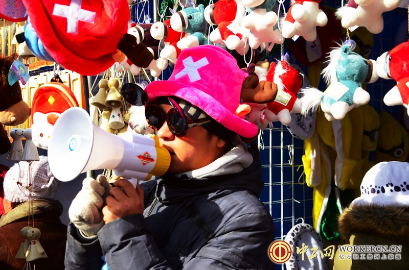 图中小贩头戴乔巴帽,脸戴卡通墨镜,手持扩音喇叭正在吸引顾客。中工网记者 笑语摄