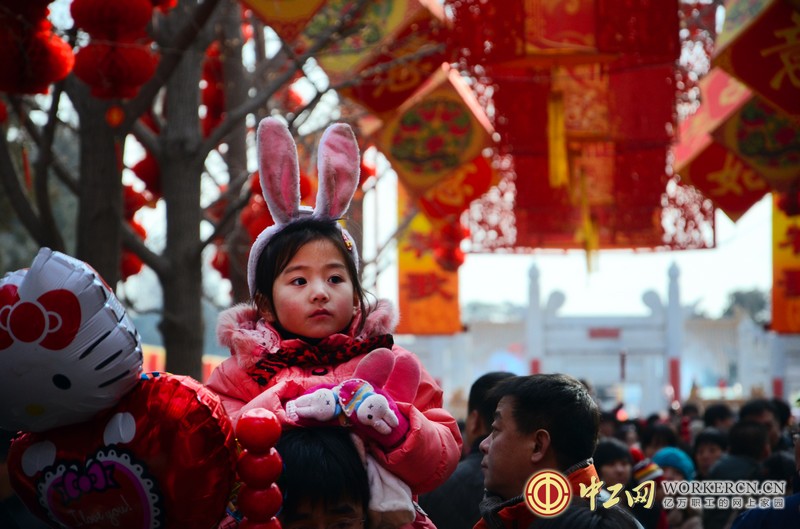 图中小女孩头戴粉色兔耳朵发夹,身穿粉色外套,手戴粉白色兔子手套。骑在家长脖子上活灵活现像一只可爱的兔子。中工网记者 笑语摄