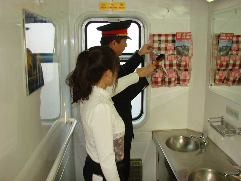 车厢外天气寒冷,但车厢内温暖舒适,干净整洁,深蓝色的坐席套和窗帘搭配的十分素雅。洗漱间的钢盆能倒影出人影,就连角落也清理的非常干净。车厢连接处的浅绿色的防滑垫不仅挡住了车外的严寒,也让经过这里的旅客更加安全。